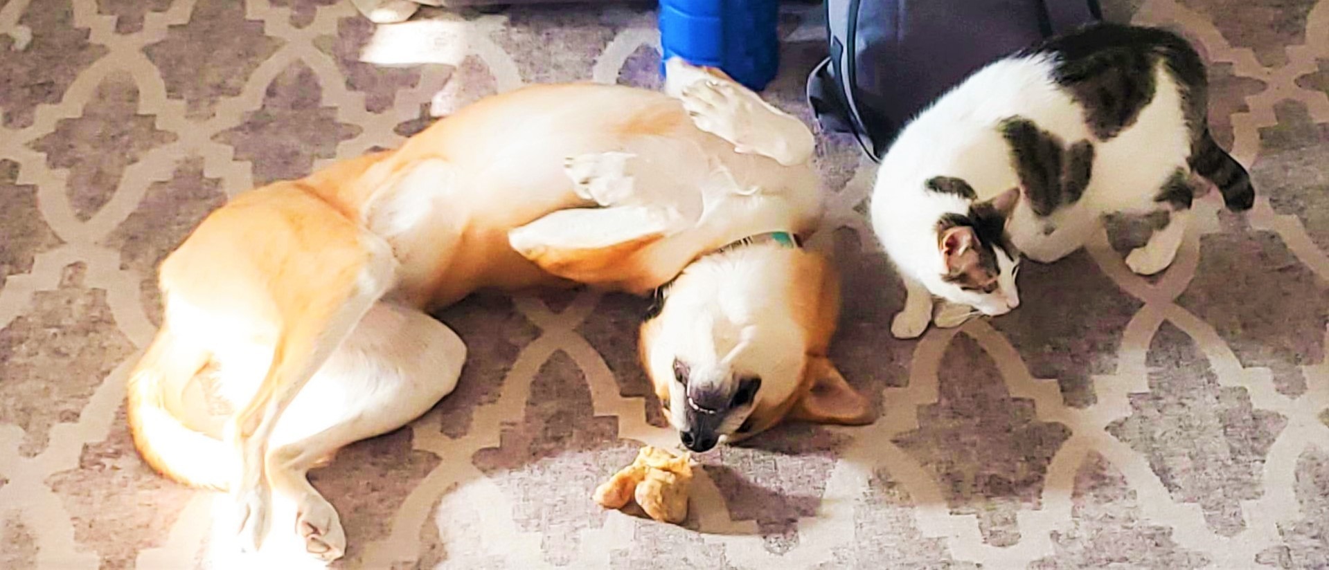 When she’s in the mood to romp around, she’ll flop down next to our dog. She lays on her back– her attempt at being aloof. She does this little unassuming lay until she’s got a body part in her sights. That’s when she’ll chomp down on his tail and bite at his ankles. He’s more bewildered than anything else, and she darts away wild-eyed.