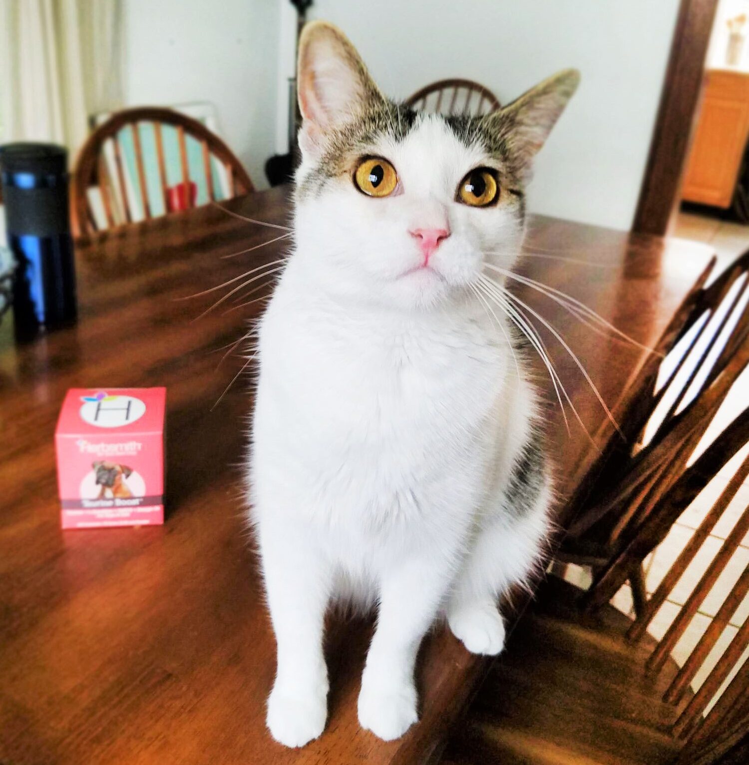 Kitty is ever so slowly shedding that weight, but it’s something we’ve had to keep at the forefront of our minds. She comes running at the slightest sound of crinkling in hopes that it’s treats. And she’s a bit of a thief. She’ll saddle up to the dog’s bowl every morning in hopes that my guard is down. If she’s successful, she steals away with a piece of freeze-dried organ meat.