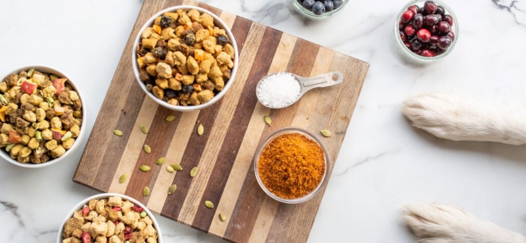 Kibble doesn’t even come close to accomplishing this. You know that super lengthy ingredient list on the back of so many kibble bags? It’s so long because the “food” ingredients are cooked to obliteration at sky-high temps, and post-processing vitamin packs add essential nutrients back into the food so it can meet Complete & Balanced Nutritional Standards.